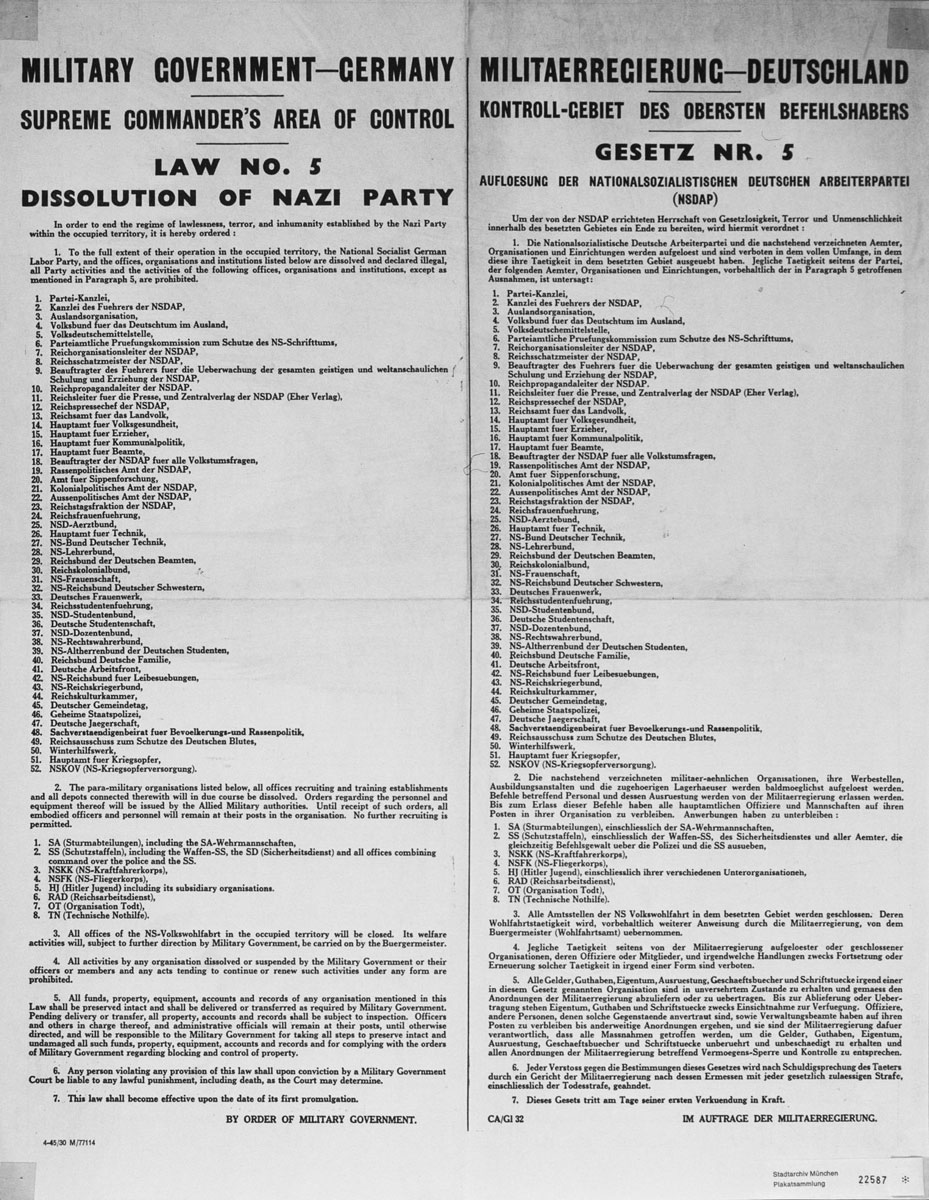 Gesetz Nr. 5 der US-Militärregierung zur Auflösung der Nationalsozialistischen Deutschen Arbeiter Partei (NSDAP) und ihrer angeschlossenen Organisationen. (Stadtarchiv München, DE-1992-PL-22587) HLB