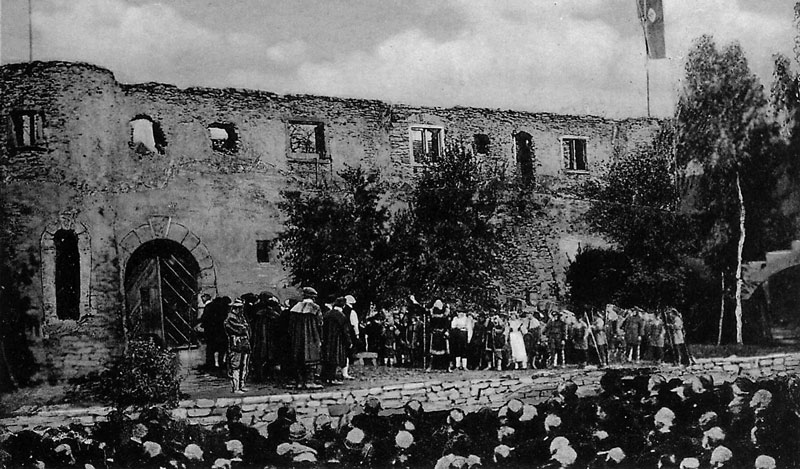 Die bereits seit 1925 aufgeführten Florian-Geyer-Festspiele vor dem Geyerschloss in Giebelstadt wurden ab 1933 z.B. durch Textänderungen nationalsozialistisch gefärbt. Die Festspiele wurden ab 1935 als "Freiheitsspiele" und der Ort der Aufführung als Thingstätte bezeichnet. Foto, c. 1933/1937. (Stadtarchiv Giebelstadt) HLB