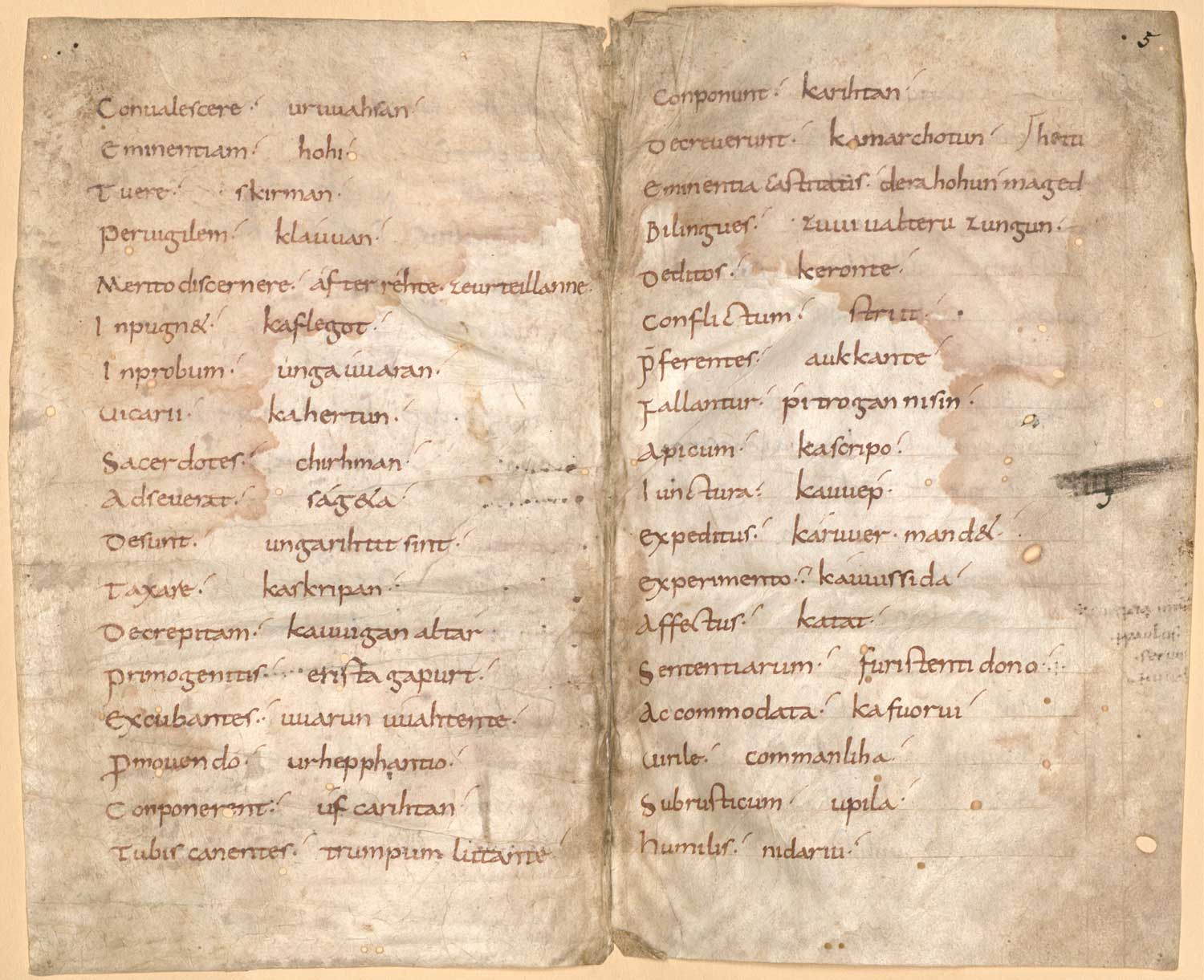 Lateinisch-deutsches Glossar zu Isidor von Sevillas "De officiis ecclesiasticis". Die Handschrift entstand in der 1. Hälfte des 9. Jahrhunderts in Freising. (Bayerische Staatsbibliothek, Clm 6325)
