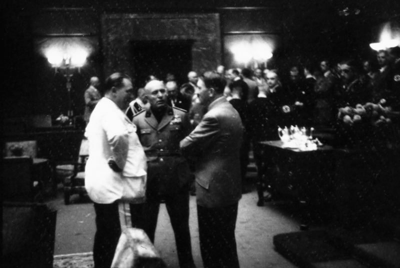 Von links nach rechts: Hermann Göring (1893-1946), Benito Mussolini (1883-1945) und Adolf Hitler (1889-1945) im Gespräch in der Großen Empfangshalle im Kanzleibau am Königsplatz im September 1938 am Rande der Verhandlungen zum Münchner Abkommen. (Bayerische Staatsbibliothek, Bildarchiv hoff-20698) HLB