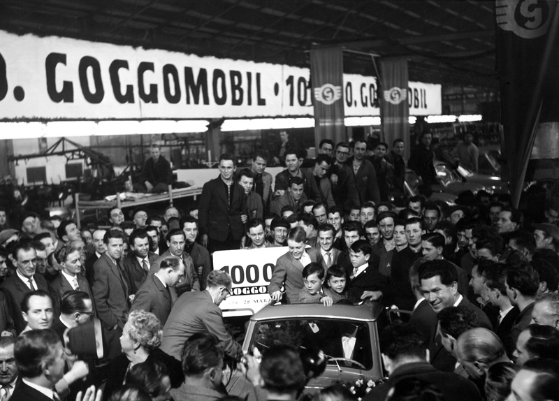 Bereits wenige Jahre nach seiner Einführung 1955 lief 1958 das 100.000ste Goggomobil vom Band. Ebenfalls 1958 wurde die 250.000ste ISARIA-Sämaschine produziert. Aufnahme vom 28.3.1958 im Glas-Werk in Dingolfing. (BMW Group Archiv, BMW UF-401-1) HLB