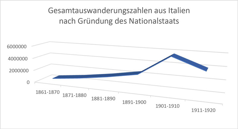 Gesamtauswanderungszahlen aus Italien von 1861 bis 1920. (Grafik: Jörg Zedler) HLB