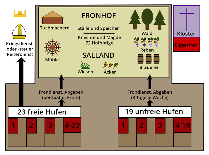 Schema des Fronhofs nach dem Staffelsee-Iventar/Urbar (nach 800). (Gestaltung: Stefan Schnupp auf Grundlage von: Karl Kroeschell, Deutsche Rechtsgeschichte. Band 1: Bis 1250, Stuttgart 2008, 88, Abbildung 6) HLB