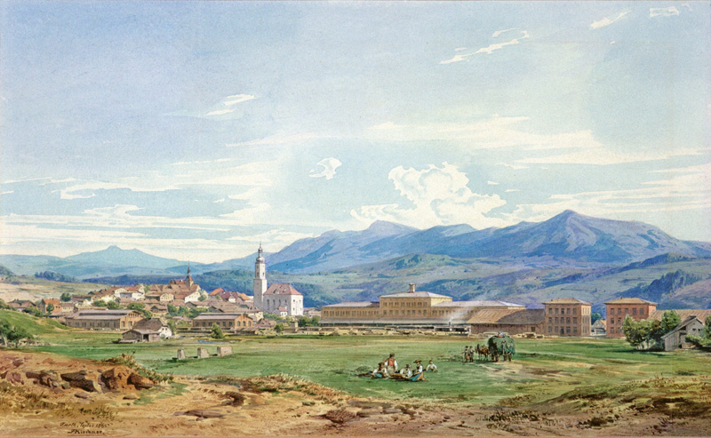 Der 1862 eröffnete Grenzbahnhof Furth im Wald. Die ausgedehnten Bahnanlagen wurden von der Bayerischen Ostbahn und der Böhmischen Westbahn gleichermaßen genutzt. Längst hat der Bahnhof seine frühere Bedeutung als personalintensive Zoll- und Wechselstation verloren. Aquarell von Albert Emil Kirchner (1813-1885). (DB Museum Nürnberg, 2021.001908) HLB