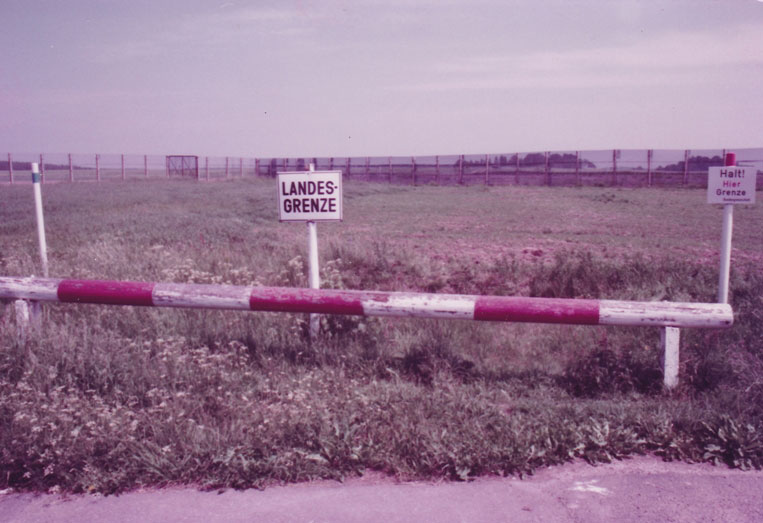Von bayerischer Seite wurde auf den Grenzverlauf zur DDR mit weiß-blauen Pfählen sowie mit den Schildern „Landesgrenze“ und „Halt! Hier Grenze“ des Bundesgrenzschutzes hingewiesen. (Bundespolizeidirektion München) HLB