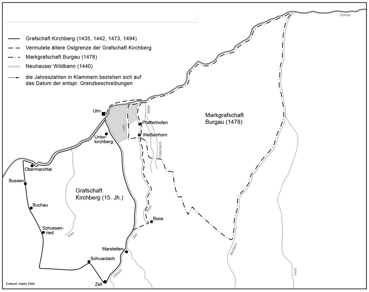 KMutmaßlicher Grenzverlauf der Grafschaft Kirchberg im 12./13. Jahrhundert. Entwurf: Sarah Hadry. (Sarah Hadry, Neu-Ulm. Der Altlandkreis. Historischer Atlas von Bayern. Schwaben Reihe I. Band 18, München 2011, Karte 4) HLB