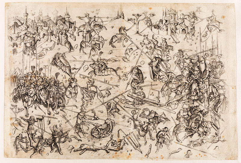 Bei dieser Darstellung der Schlacht von Hiltersried handelt es sich um einen der frühesten erhaltenen Kupferstiche. Der Stich, der wohl bald nach der Schlacht im Jahr 1433 entstand, wird in der Kunstgeschichte meist als „Große Schlacht“ bezeichnet und befindet sich heute in der collection Rothschild im Louvre in Paris. (photo © RMN-Grand Palais (musée du Louvre) / Philippe Fuzeau) HLB