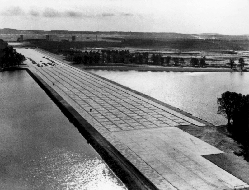 Luftfoto der Großen Straße, 1938. Die bis 1939 weitgehend vollendete Große Straße bildete die Mittelachse des Reichsparteitagsgeländes und führte nach Südosten (hier oben) zum Märzfeld. (unbekannter Fotograf, Dokumentationszentrum Reichsparteitagsgelände Ph-0755-09) HLB