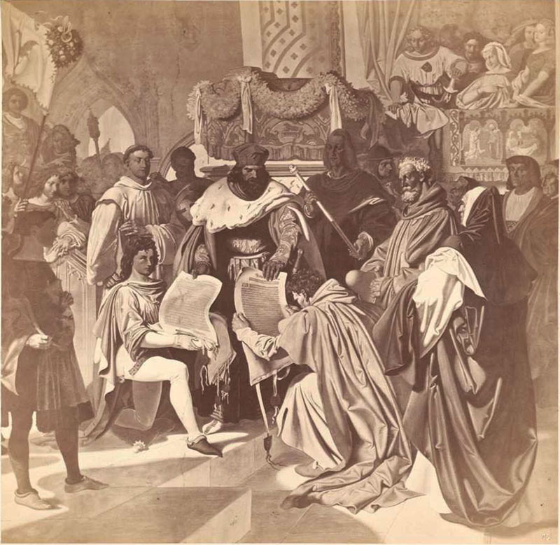 Gründung der Universität Heidelberg durch Rupprecht I. Fotografie eines Gemälde im alten Bayerischen Nationalmuseum von Albert Adamo (1849-1887). (Abb. aus: Spruner, Karl von: Die Wandbilder des Bayerischen National-Museums, Bd.: 3, Pfalz, München, 1868, Taf. 76)