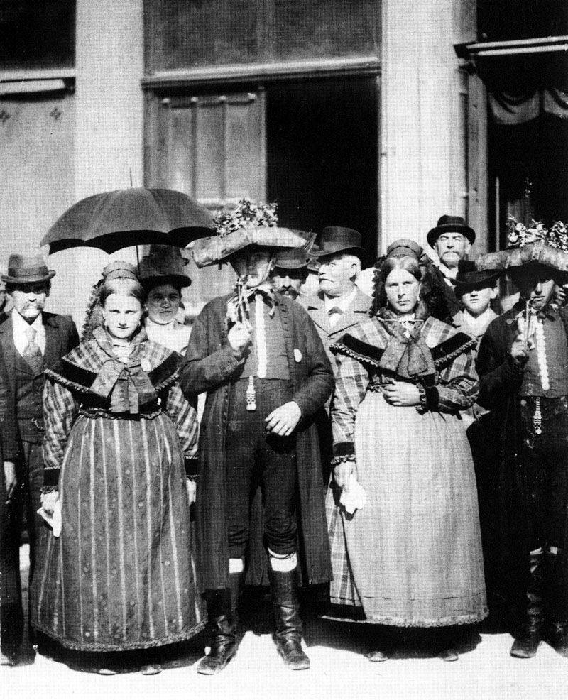 Eine Gruppe aus Neunhof beim ersten Historisch-Bayerischen Trachtenfest in München. (Stuffler, M.: Bayerische Trachten. 25 Fotografien, 1895; auch in: Selheim, Claudia: Bildzitate und die Musealisierung der Tracht - Ein Beispiel aus der Sammlung Kling des Germanisches Nationalmuseums, in: Murr, Karl Borromäus u. a. (Hrsg.): DIe süddeutsche Textillandschaft, Augsburg 2010, S. 411)