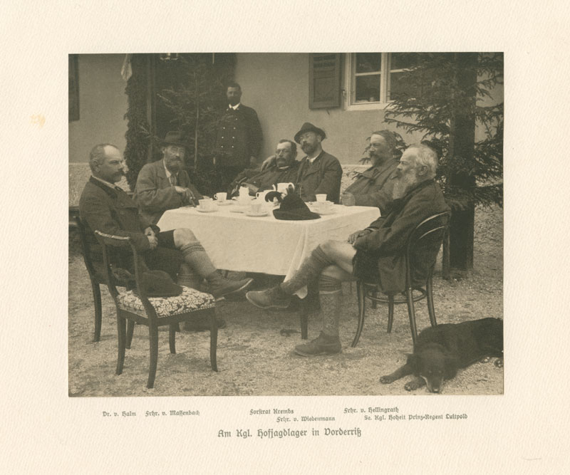 Königliches Hofjagdlager um 1900/1910 in Vorderriß (Lkr. Bad Tölz-Wolfratshausen). Von links nach rechts: Alfred von Halm (Mediziner, 1844-1919), Max von Massenbach (1873-1963), Max von Krembs (Forstrat, Hofjagdinspektor, 1869-?), Peter von Wiedenmann (Vorstand der Geheimkanzlei und zugleich Generaladjutant des Prinzregenten, 1847-1917), Fritz von Hellingrath, (Maler, Radierer, Oberst 1866-1946), Prinzregent Luitpold von Bayern (1821-1912). (Bayerische Staatsbibliothek, Bildarchiv port-033920) HLB