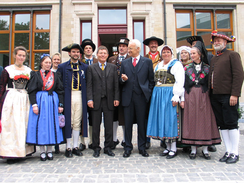 Gruppenfoto bei der Einweihung der neuen bayerischen Vertretung mit Ministerpräsident Edmund Stoiber (CSU, geb. 1941, Ministerpräsident 1993-2007) und dem damaligen Staatsminister für Europaangelegenheiten und regionale Beziehungen, Eberhard Sinner (CSU, geb. 1944, Europaminister 2003-2005), und einer bayerischen Trachtengruppe. (© Bayerische Staatskanzlei) HLB
