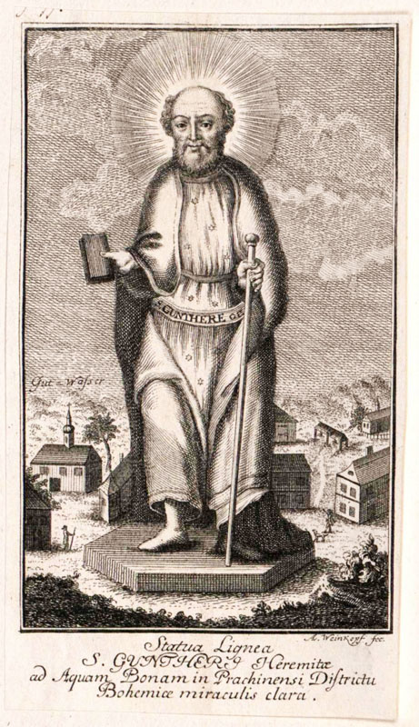 Darstellung des Heiligen Gunther von Niederalteich auf einem Kipferstich von Elias Müller, 1. Hälfte 18. Jahrhundert. (Österreichische Nationalbibliothek, Porträtsammlung, Inventarnr. PORT_00113479_01)