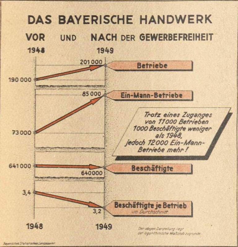 Vergleich des Handwerks in Bayern vor (1948) und nach (1949) der Gewerbefreiheit. Abb. aus: Bayerisches Landesamt für Statistik (Hg.): Bayern in Zahlen. 5. Jahrgang, Januar 1951, Einlage nach S. 304. (© Bayerisches Landesamt für Statistik, Fürth, 1951) HLB