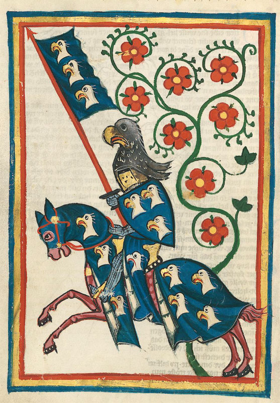 Darstellung des Hartmann von Aue (gest. zwischen 1210 und 1220) im Codex Manesse (Universitätsbibliothek Heidelberg, Cod. Pal. germ. 848, fol. 184v, lizensiert durch CC-BY-SA-3.0.)