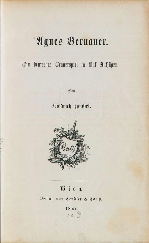 Titelblatt des Bühnenstücks "Agnes Bernauer" von Friedrich Hebbel (1813-1863). (Bayerische Staatsbibliothek, P.o.germ. 1907 u)