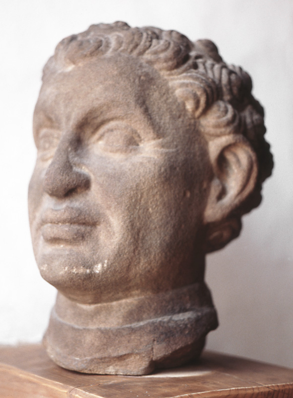 Kopf des heiligen Mauritius, ehemals Teil einer Mauritiusfigur in der Coburger Moritzkirche, Steinbildwerk, Sandstein, 14./15. Jahrhundert. (Stadt Coburg, Stadtarchiv) HLB