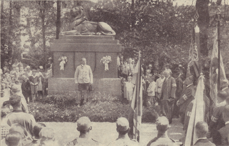 Heldenehrung am Kriegerdenkmal in Bad Aibling. Der Gauführer vom Bund Chiemgau, Forstmeister Jäger, spricht. Rechts Forstrat Escherich. Abb. aus: Bayerischer Heimatschutz, 2. Jahrgang 1931/Nr. 21, 161. (Bayerische Staatsbibliothek, 4 Bavar. 3212 y-1/2) HLB