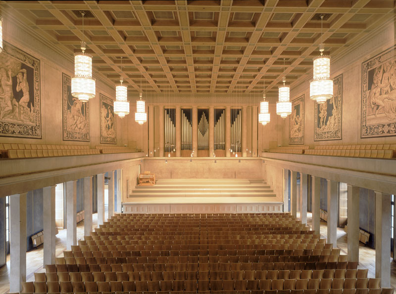 1952 wurde anstelle des zerstörten Thronsaales der Münchner Residenz der Neue Herkulessaal als Konzertsaal für das Symphonieorchester des Bayerischen Rundfunks errichtet. Der Entwurf stammt von Rudolf Esterer, der sich bei der Farbgebung an den Wandteppichen der namensgebenden Herkulesfolge orientierte. (© Bayerische Schlösserverwaltung)