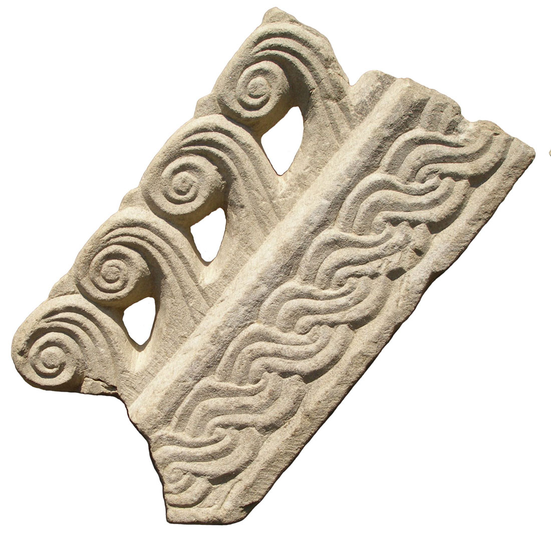 Giebelbalkenfragment mit Flechtmuster, ehemalige Klosterkirche St. Salvator, Herrenchiemsee, um 820. (Foto: Hermann Dannheimer. Archäologische Staatssammlung München) HLB