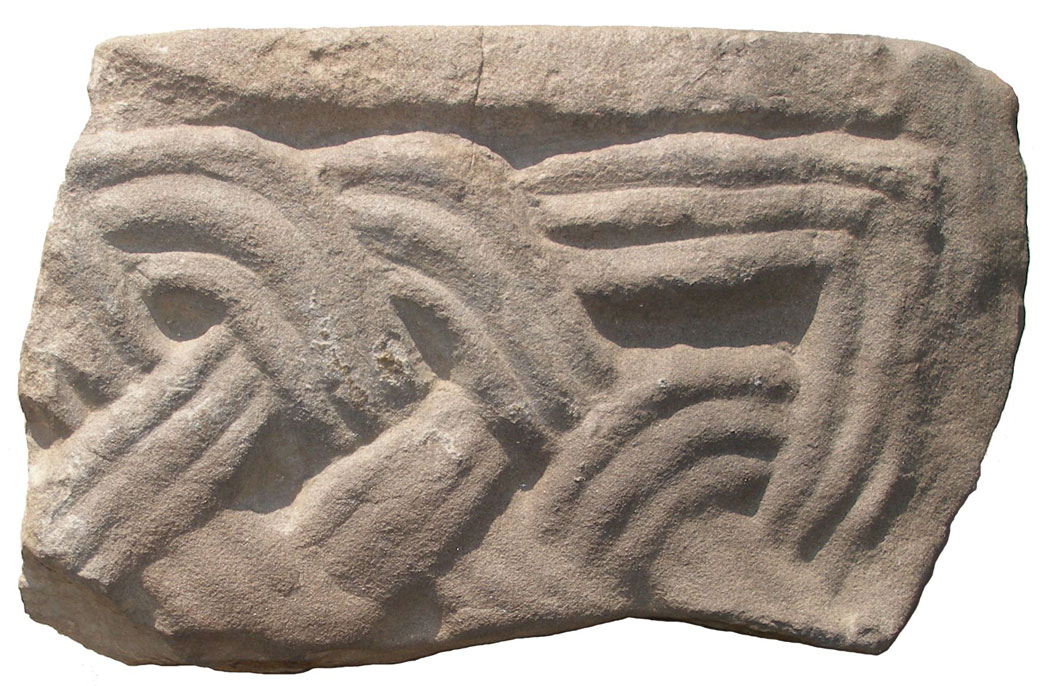 Plattenfragment mit Flechtmuster, ehem. Klosterkirche St. Salvator, Herrenchiemsee, um 820. (Foto: Hermann Dannheimer. Archäologische Staatssammlung München) HLB
