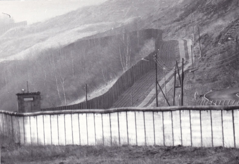Moderne Grenze mit Betonsperrmauer bei Hirschberg (Thüringen). Bayerische Grenzsicherungskräfte registrierten die neuen Zaunanlagen erstmalig im Februar 1967 bei Effelder (Thüringen) bzw. Meilschnitz. (Bundespolizeidirektion München) HLB