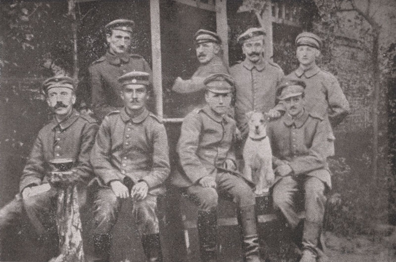 Adolf Hitler (1889-1945) (vorne links) mit den Kameraden seiner Meldegänger-Einheit im Garten des Regimentshauptquartiers in Fournes 1915. Abb. aus: Balthasar Brandmayer, Mit Hitler, Meldegänger 1914-18, Überlingen a. Bodensee 1940, n. 16. (Bayerische Staatsbibliothek, 41.5057)