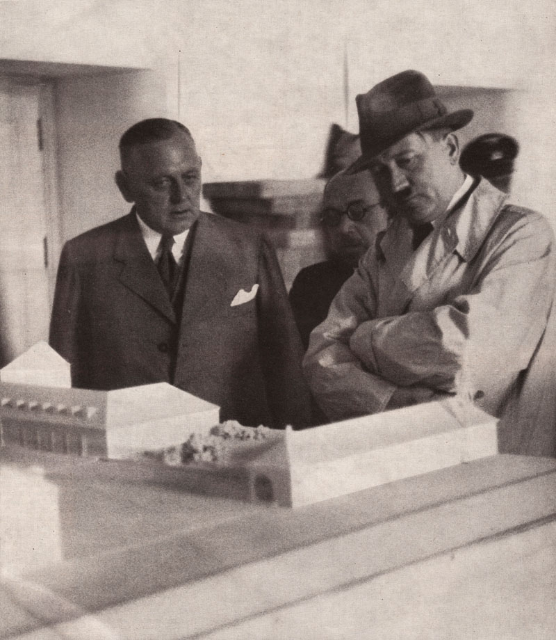 Hitler neben Fritz Wächter (1891-1945), dem Gauleiter (seit 1935) des Gaues Bayerische Ostmark (Bayreuth) bei der Begutachtung des Modells des Festhallenbaues Bayreuth. (aus: Das Deutschland Adolf Hitlers. Die ersten vier Jahre des Dritten Reichs. Sonderbeilage Gau Bayerische Ostmark, München 1937, 112a)