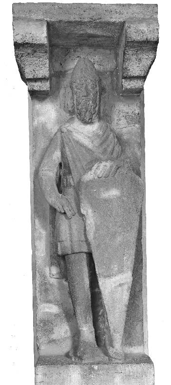 Romanische Kalksteinfigur des hl. Mauritius aus Kloster Niederaltaich (Lkr. Deggendorf), ca. 1250. (Bayerisches Nationalmuseum, Inventarnr.: MA 116)