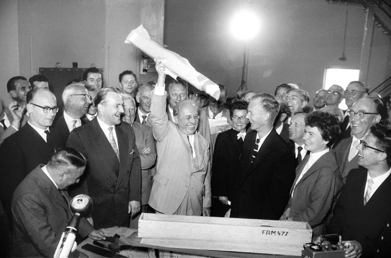 Der bayerische Ministerpräsident Wilhelm Hoegner präsentiert 1957 Brennstäbe für Garching. (Stadtarchiv München, Rudi-Dix-Archiv RD0610A11)