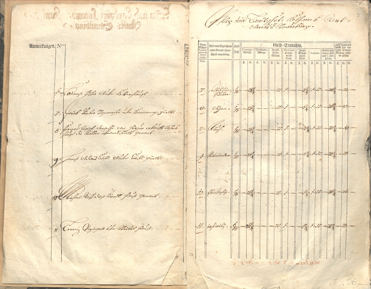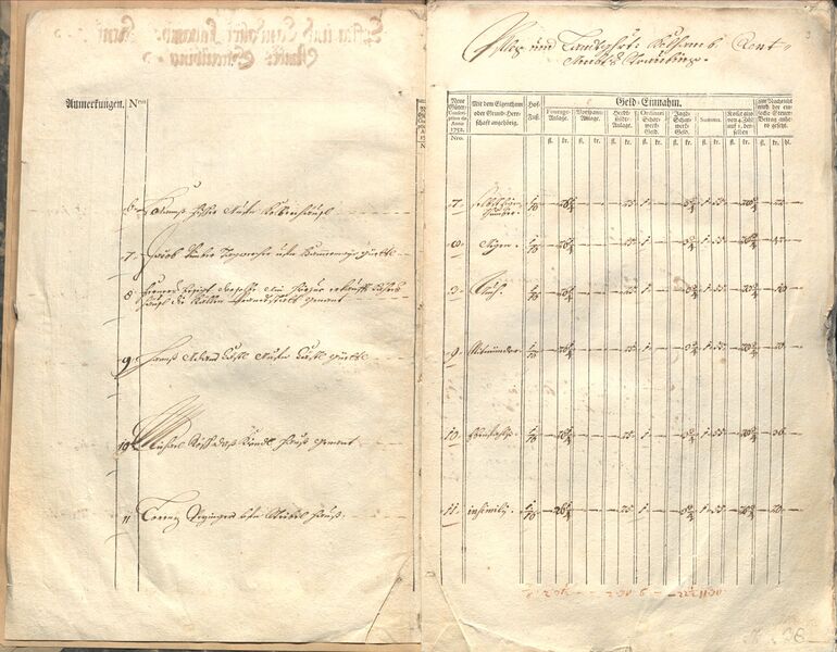 Seite aus dem Hofanlagsbuch des Pfleggerichts Kelheim, in dem, wie auch im übrigen Bayern, 1760 erneut für alle Anwesen die fälligen Abgaben verzeichnet wurden, hier für Einwohner des Amts Teugn. (Bayerisches Hauptstaatsarchiv, Kurbayern Hofkammer, Hofanlagsbuchhaltung Bände 376)