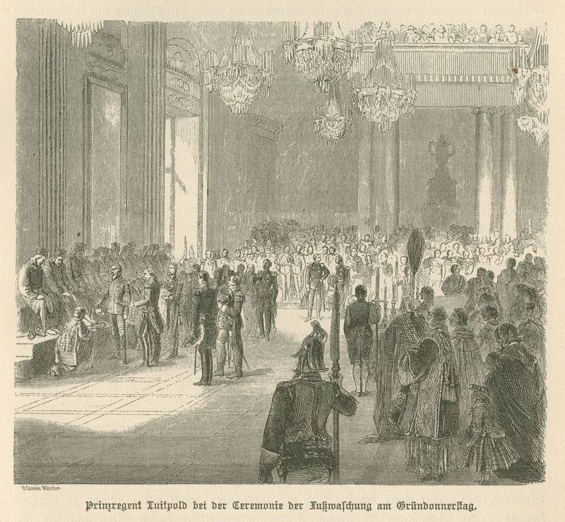 Hoffußwaschung mit Prinzregent Luitpold (1821-1912), Gründonnerstag 1891. Reproduktion nach Oscar Consée. (Bayerische Staatsbibliothek, Bildarchiv port-034320) HLB