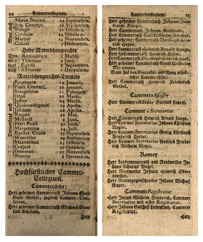 Verzeichnis der Bayreuther Hofkammer 1768. Abb aus: Hochfürstlich-Brandenburgisch-Culmbachischer Address- und Schreib-Calender, Bayreuth 1768, 14f. (Bayerische Staatsbibliothek, Bavar. 52 os-768)