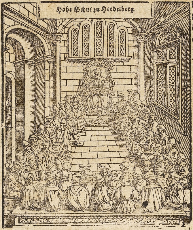Holzschnitt "Hohe Schul zu Heydelberg". Bei dem dargestellten Raum handelt es sich um die ehemalige Synagoge, die Marienkapelle. (aus: Sebastian Münster: Cosmographia, Das ist: Beschreibung der gantzen Welt Darinnen Aller Monarchien Keyserthumben, Königreichen, Fürstenthumben, Graff- vnd Herrschafften, Länderen, Stätten vnd Gemeinden …, Basel: Sebastian Henricpetri 1628, UB Heidelberg, A 129 I Folio RES, S. 1044)