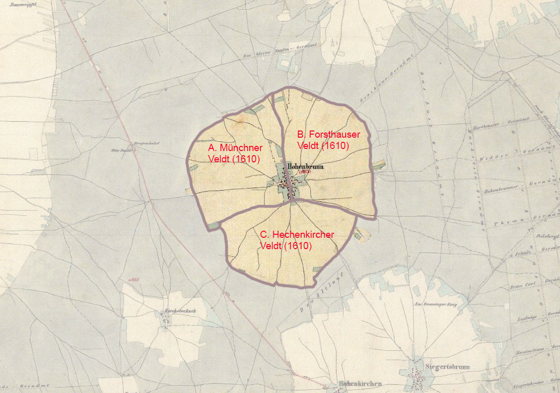 Abbildung 1: Rekonstruktion der Zelgeneinteilung von Hohenbrunn (Ldk. München). Die drei Grossfelder bzw. Zelgen werden in den Quellen seit dem 17. Jahrhundert als "Veldt" bzw. "Felder" bezeichnet. (Geobasisdaten: Bayerische Vermessungsverwaltung, lizenziert durch CC BY-ND 3.0 DE; ergänzende Gestaltung wie Schrift und Markierungen mit Genehmigung der Bayerischen Vermessungsverwaltung: Laura Niederhoff) HLB
