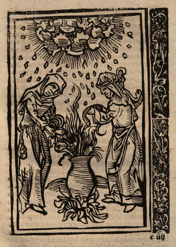 Holzschnitt mit Darstellung eines Hagelzaubers, aus: Ulrich Molitoris, Von den unholden oder Hexen, Ausgburg 1508. (Bayerische Staatsbibliothek, Res/4 H.g.hum. 16 o) HLB
