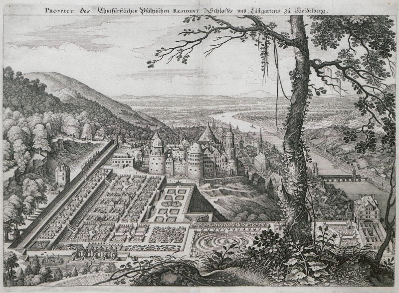 Hortus Palatinus und Heidelberger Schloss von Osten. Kupferstich von Matthäus Merian (1593-1650) nach einer Vorlage von 1616. Abb. aus: Martin Zeiller/Matthäus Merian [Hg.], Topographia Palatinatus Rheni et vicinarum Regionum [Frankfurt a.M.], 1645 (UB Heidelberg lizensiert durch CC-BY-SA 3.0 DE)