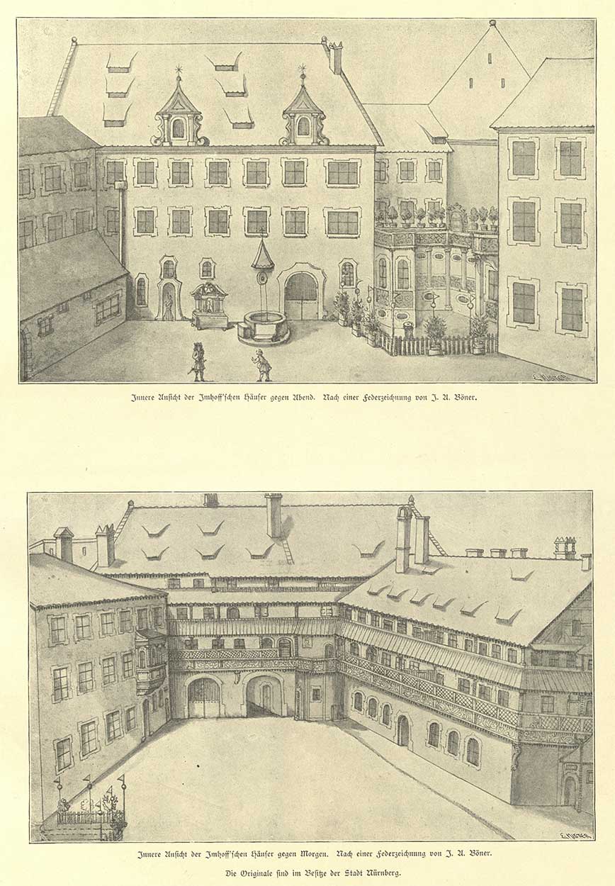 Ansicht der Imhoffschen Häuser in Nürnberg. Das Gebäude befand sich an der Ecke Brunnengasse und Königstraße. Es war der älteste Wohnsitz der Familie Imhoff in Nürnberg. Federzeichnungen von Johann Alexander Böner (1647-1720). Abb. aus: Hugo Barbeck, Alt-Nürnberg. Kulturgeschichtliche Bilder aus Nürnbergs Vergangenheit, Bd. 11: Haus und Hof Alt-Nürnbergs, Nürnberg 1898, Blatt 7. (Bayerische Staatsbibliothek, 2 Bavar. 32 v-11/14)