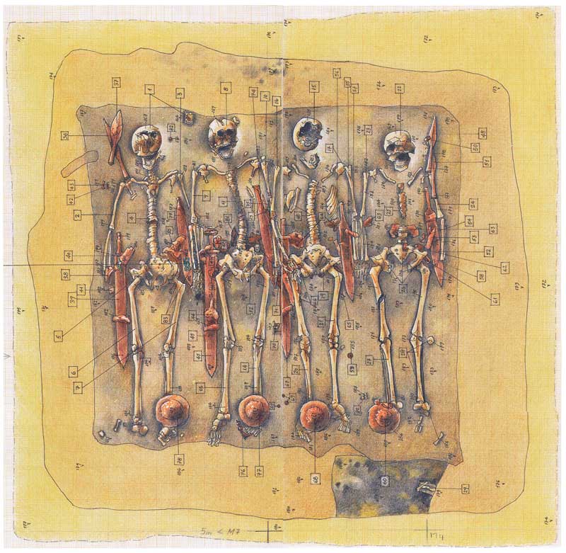 Abb. 4: Inningen, Stadt Augsburg, Grab 8. Bestattung von vier bewaffneten Männern, die im 7. Jahrhundert gleichzeitig und wohl gemeinsam starben. Ihre demonstrative Haltung verweist auf die Aufbahrung. (Kunstsammlungen und Museen Augsburg, Stadtarchäologie Dokumentationsarchiv) HLB