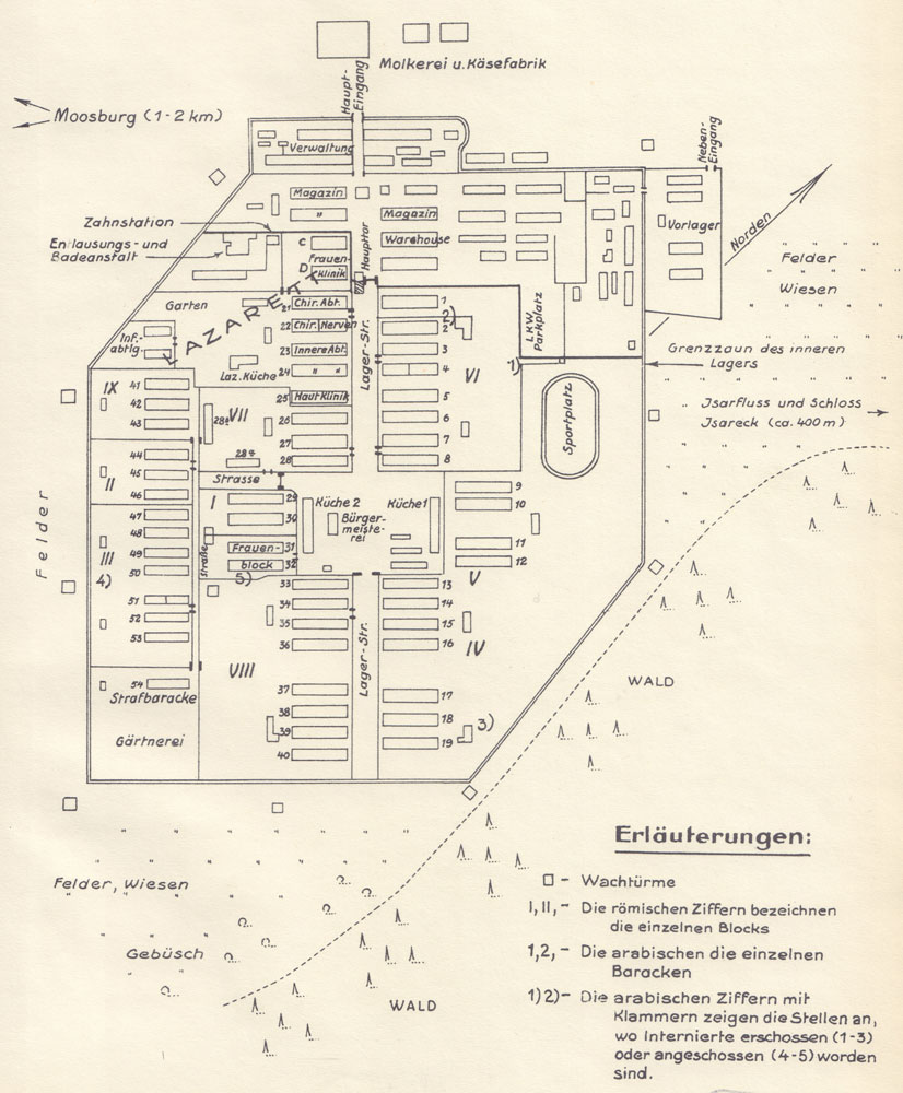 Übersichtsplan des Internierungslagers Moosburg. (Abb. aus Hans Diester, Meine Erlebnisse im amerikanischen Internierungslager Moosburg, 1945-1946. (Bundesarchiv Koblenz, ZSG 158/2)