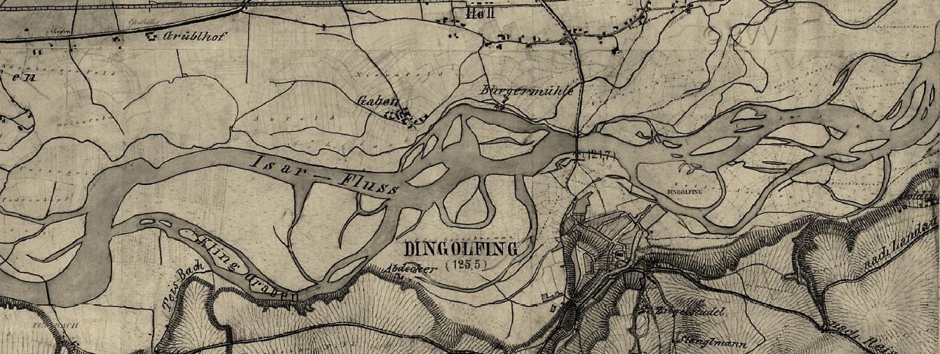 Die Isar bei Dingolfing um 1860. Beispiel eines unregulierten Wildflusses mit vielen, sich verändernden Haupt- und Nebenarmen. (Geobasisdaten: Bayerische Vermessungsverwaltung, lizenziert durch CC BY-ND 3.0 DE) HLB