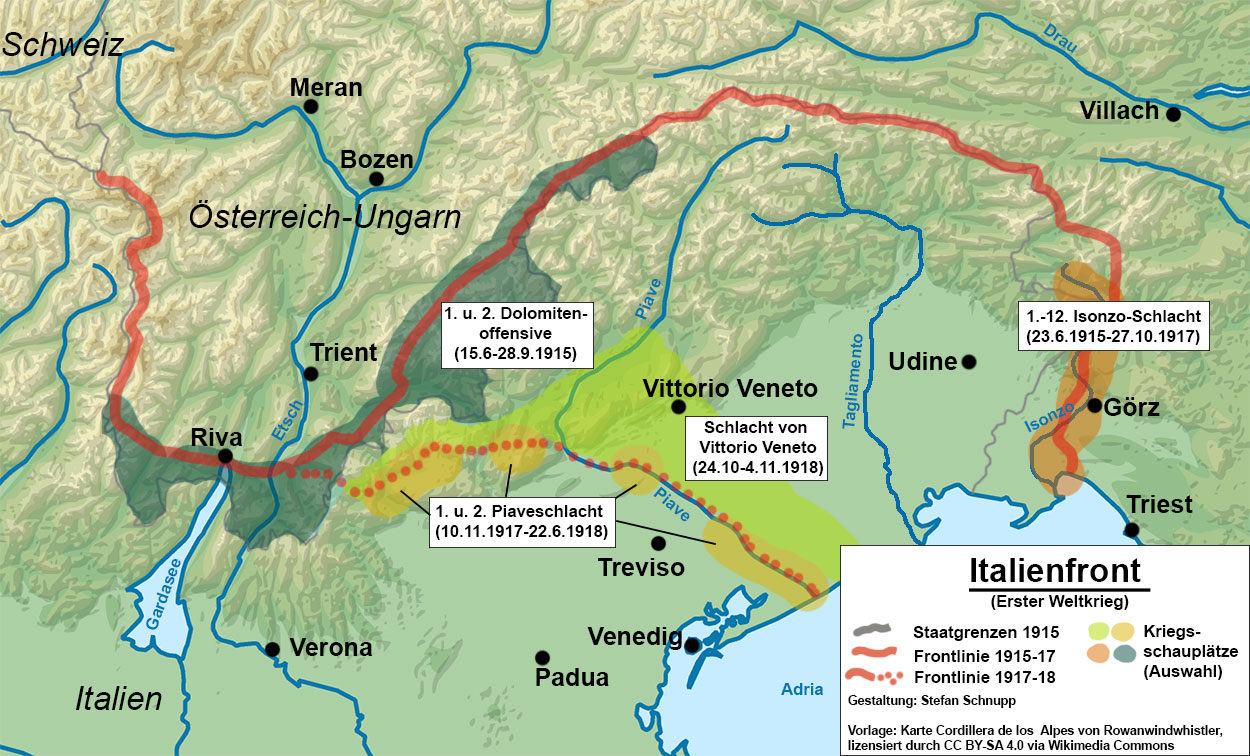 Karte des Frontverlaufes der Italienfront im Ersten Weltkrieg von 1916 bis 1918. (Gestaltung: Stefan Schnupp; Kartevorlage: Rowanwindwhistler: Cordillera de los Alpes, lizenziert durch CC BY-SA 4.0 via Wikimedia Commons) HLB