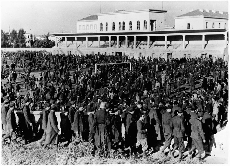 Gefangene italienische Soldaten in einem Stadion in Bozen, September 1943. Foto: Rieder. (Bayerische Staatsbibliothek, Bildarchiv hoff-46752) HLB