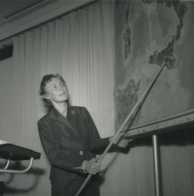 Vortrag von Ursula Schaarschmidt (geb. 1919) zum Thema "Süditalienische Frage" am 7. November 1955 im Italienischen Kulturinstitut in München. Foto vom Felicitas Timpe (1923-2006). (Bayerische Staatsbibliothek, Bildarchiv timp-023772) HLB