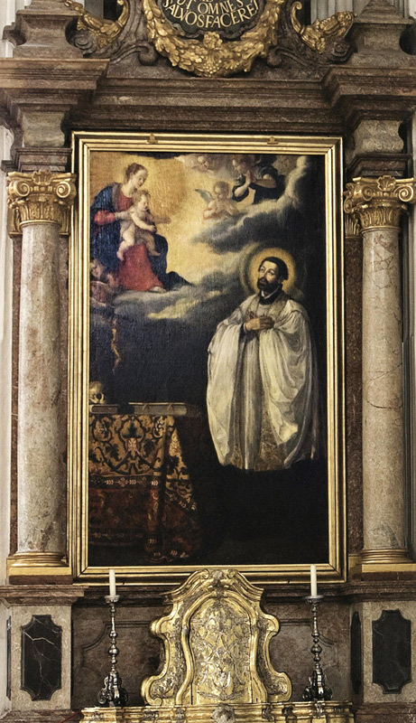 Johann Ulrich Loth (1599-1662), Darstellung des Heiligen Franz Xaver (1506-1552), Altarbild aus St. Michael (München), 1624: Bayern entwickelte sich nach der Reformation zum wichtigen Ausgangspunkt der Gegenreformation nördlich der Alpen. Besonders Herzog Albrecht V. (1528-1579, Herzog 1550-1579) trieb diese Entwicklung vehement voran. Mit seiner Unterstützung gründete der Jesuitenorden in München 1574/76 ein Gymnasium. Unter seinem Sohn Herzog Wilhelm V. (1548-1626, Herzog 1579-1597) erweiterten die Jesuiten das Gymnasium um ein Studienkolleg und die Kirche St. Michael. Das Münchner Jesuitenkolleg gilt mit der Michaelskirche als eines der bedeutendsten geistigen Zentren der Gegenreformation. Der auf dem Altarbild dargestellte Heilige Franz Xaver aus Javier bei Pamplona (Spanien) schloss sich bald der Bewegung um Ignatius von Loyola (1491-1556) an. Gemeinsam gründeten sie wenig später den Jesuitenorden. In der Folge wurden die Namen Franz und Xaver beliebte Vornamen in Bayern. ([Foto von Semofa lizensiert durch CC BY-SA 4.0 via Wikimedia Commons) HLB