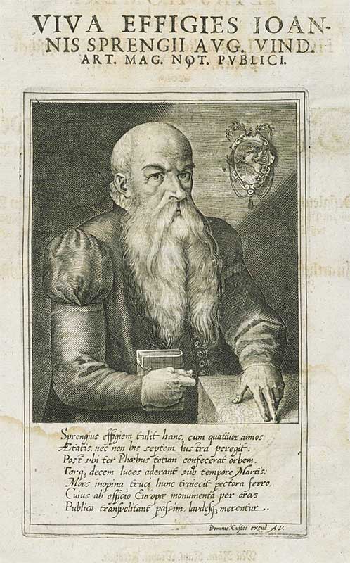 Johannes Spreng (1524-1601), Kupferstich von Dominik Custos (1560-1612). Abb. aus: Johannes Spreng, Ilias Homeri, Augsburg 1610, Frontispiz. (Bayerische Staatsbibliothek, 2 A.gr.a. 33 a)