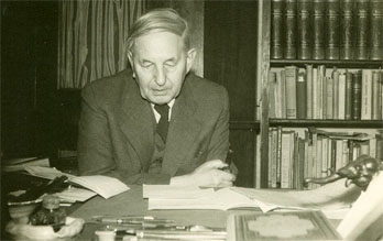 Der schwäbische Theologe und Dichter Joseph Bernhart (1881-1969) in seinem Arbeitszimmer, ca. 1950. (Foto: Joseph-Bernhart-Gesellschaft e.V.)