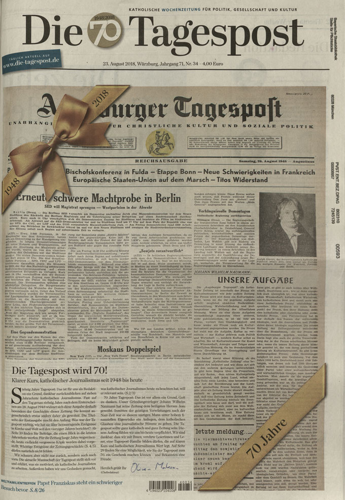 Titelblatt der Jubiläumsausgabe der Tagespost vom 22.8.2018 (70 Jahre) mit Abbildung der ersten Ausgabe der Zeitung vom 28.8.1948. (Die Tagespost) HLB