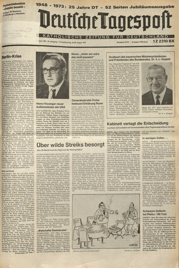 Titelblatt der Jubiläumsausgabe der Tagespost vom 24./25.8.1973 (25 Jahre). (Die Tagespost) HLB