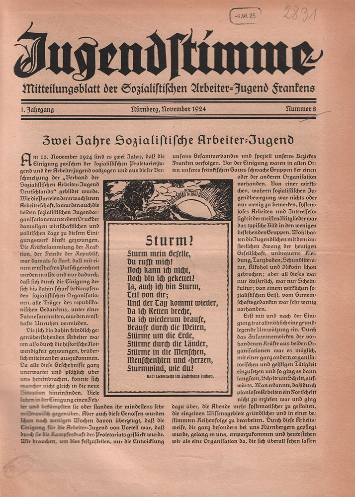 Titelblatt des Mittelungblattes "Jugendstimme" der Sozialistischen Arbeiter-Jugend Frankens. (Bayerische Staatsbibliothek, 4 Bavar. 3191 a-1/3)